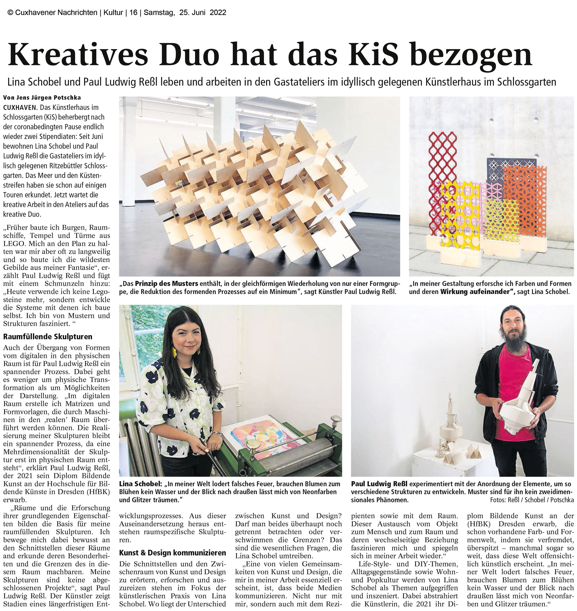 Artikel aus den Cuxhavener Nachrichten vom 25. Juni 2022 über unsere aktuellen Gastkünstler Lina Schobel und Paul Ressl.